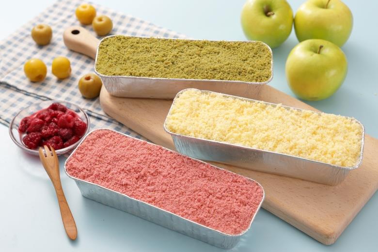 「青蘋果雪絨芝士」選用口感鮮脆而酸甜的台灣青蘋果切丁製成夾層內餡,和綿密細緻的乳酪超乎意外的合拍,上層撒上猶如雪花般的香草蛋糕粉,清新爽口是夏日初戀的滋味。