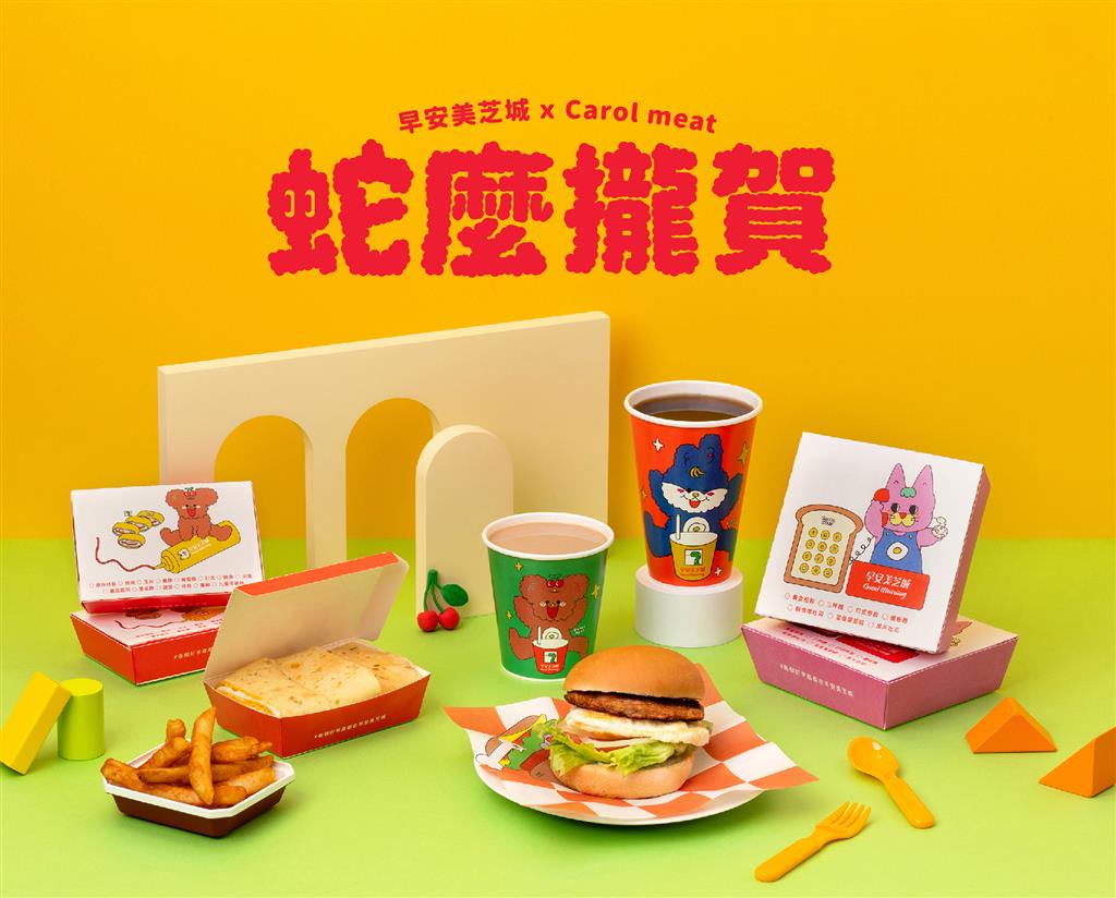 台灣插畫藝術家Carol Meat為早安美芝城特別繪製四款蛇年限定插畫包裝,每款都充滿濃厚的新年氛圍,這次飲料杯身上有貴賓狗-趴皮及玉蘭,為大家喚醒早起活力;吐司盒上貓咪-乖咪店員精神奕奕地接待顧客,象徵早餐店的元氣充電站;蛋餅盒上貴賓狗趴皮乘坐醬油膏瓶,各種口味隨你喜好選擇;紫狗陪著你享用漢堡堡,讓你新的一年吃的健健康康胖胖圓圓,每款圖像皆有插畫家Carol Meat寓含新年滿滿精神與溫暖和融化的瞬間,陪伴大家迎接新的挑戰。