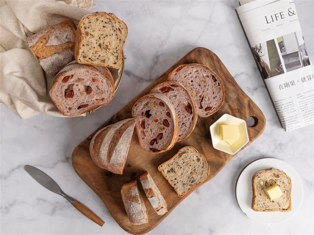 此外,他還推出另外2款充滿台灣風味與健康概念的麵包。「甜如蜜」選用拉拉山水蜜桃果乾,搭配茶葉發酵種液、荔枝酒釀果乾,再加入葡萄乾、蔓越莓、藍莓與柚子丁,營造層次豐富的果香風味,讓麵糰與果乾相互融合,甜美如蜜。「五穀豐收」則嚴選五種以上豆類、堅果與穀物,不添加精緻砂糖,僅以蜂蜜增添自然甜味,搭配15年以上的自養魯邦種,成就最健康營養的烘焙佳作。目前作品皆於「丰里烘焙坊」社團上限量開團販售,還提供全台冷凍宅配服務,讓全台粉絲有機會品嚐比賽級的手作美味!