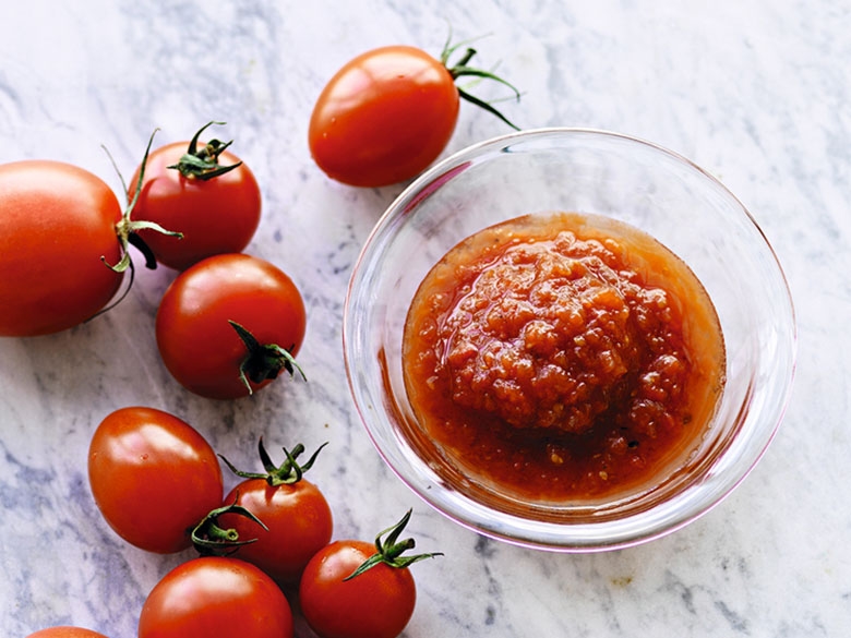 Step 2番茄去籽切丁,紅蔥去皮切末,放入平底鍋中煮成滑順的番茄糊。