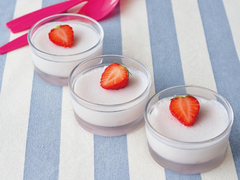 Step 2平均倒入杯中,放置冰箱冷藏2小時以上凝固。將草莓直向對切後,放在成品上裝飾。