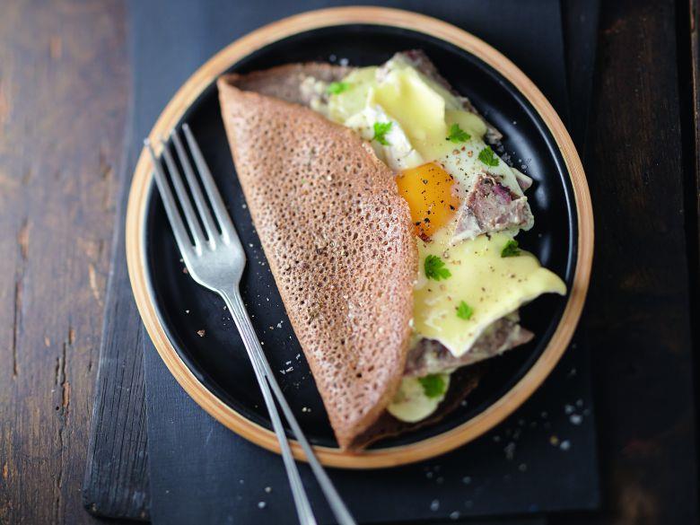 TIPS 1製作6份美味薄餅:每個盤子上放一片薄餅,將法式酸奶油煮的馬鈴薯平均分配到這些薄餅上,加上卡門貝爾乳酪,然後再疊上一個煎蛋。把薄餅折疊起來。然後做另外6份薄餅。