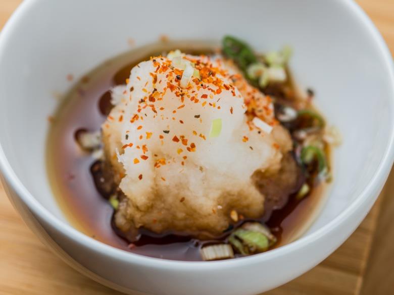 食材:柴魚醬油3大匙、白蘿蔔泥2大匙、七味辣椒粉1/6茶匙、蔥花少許