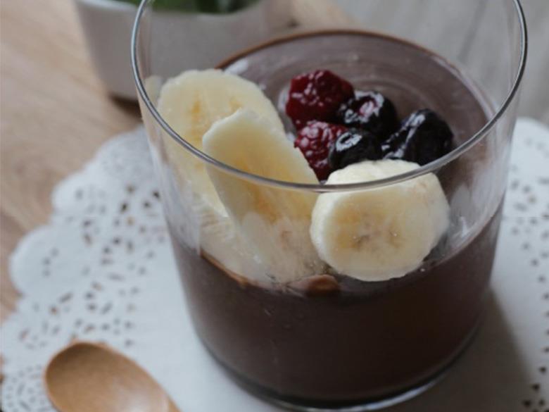 Step 3倒入容器內,放入冰箱冷藏至隔夜(至少6小時),食用前擺上香蕉片,可撒上可可碎或是喜歡的新鮮莓果