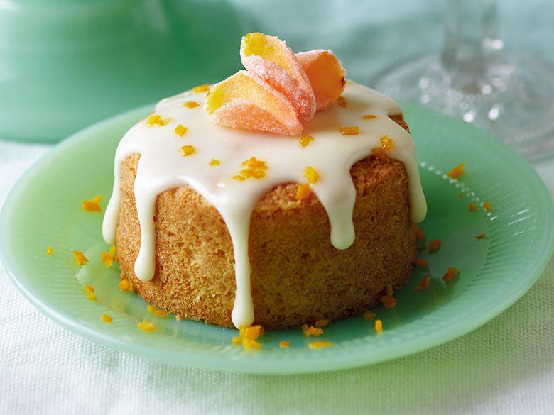 Step 3將小柑橘汁和小柑橘皮拌入蛋糕糊中,並將混料均分至蛋糕模中。你可以用湯匙舀麵糊,或是將麵糊填入擠花袋中,方便擠出。在預熱好的烤箱裡烘烤20─30分鐘,烤至蛋糕呈現金棕色,用手按壓,蛋糕會彈回,而且用刀子插入每塊蛋糕的中心,刀子不會沾附麵糊為止。讓蛋糕在模中放涼幾分鐘,然後用鋒利的刀劃過每個圓形蛋糕模內部周圍,將蛋糕脫模。將蛋糕擺在網架上,放至完全冷卻。