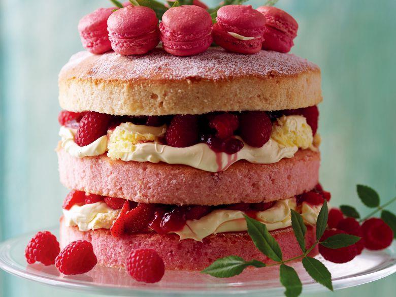 這道以新鮮莓果作為內餡,並在頂端放上甜美馬卡龍的漂亮蛋糕,即使擺在高級法式甜點專賣店的櫥窗裡也不會格格不入。
