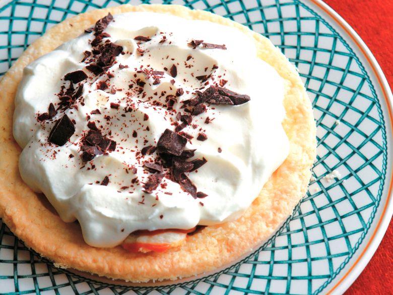 Step 3將2的鮮奶油舀至表面蓋住香蕉,以湯匙背面拉出尖角。最後撒上巧克力碎屑即完成。