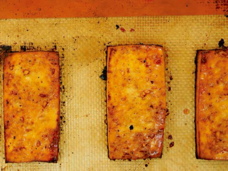 Step 5從醃醬中取出豆腐(保留醬汁),平鋪在淺烤盤上,烤15分鐘。翻面,將一小匙的醬汁淋在豆腐上,再烤10分鐘。翻面,再次刷上醬汁,最後再烤5分鐘。豆腐的邊邊應該看起來有點焦。是這樣的效果沒錯,別慌。讓烤好的豆腐放置2分鐘,變得硬一點,然後切成你需要的形狀和分量。
