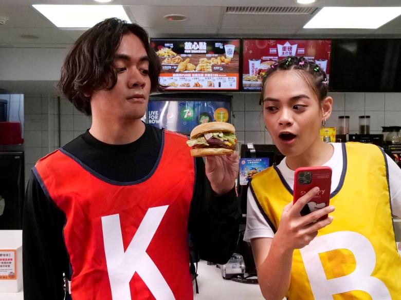 漢堡王推出「國王快訂」外帶服務,主打快速、方便,更具環保行動力。近期宣傳影片邀請到全明星運動會最具爆發力的鐵木蘭代表吱吱郭芝吟,以及知名喜劇演員喬瑟夫兩位被網友戲稱「失散多年的兄妹」組合,進行一次史無前例的速度對決。