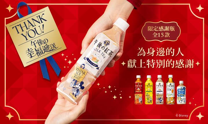 台灣麒麟「午後の紅茶」與日本同步推出「午後の幸福遞送 感謝瓶限定包裝」,攜手迪士尼人氣角色,針對不同對象給予對應的祝福語,全套共有15款。
