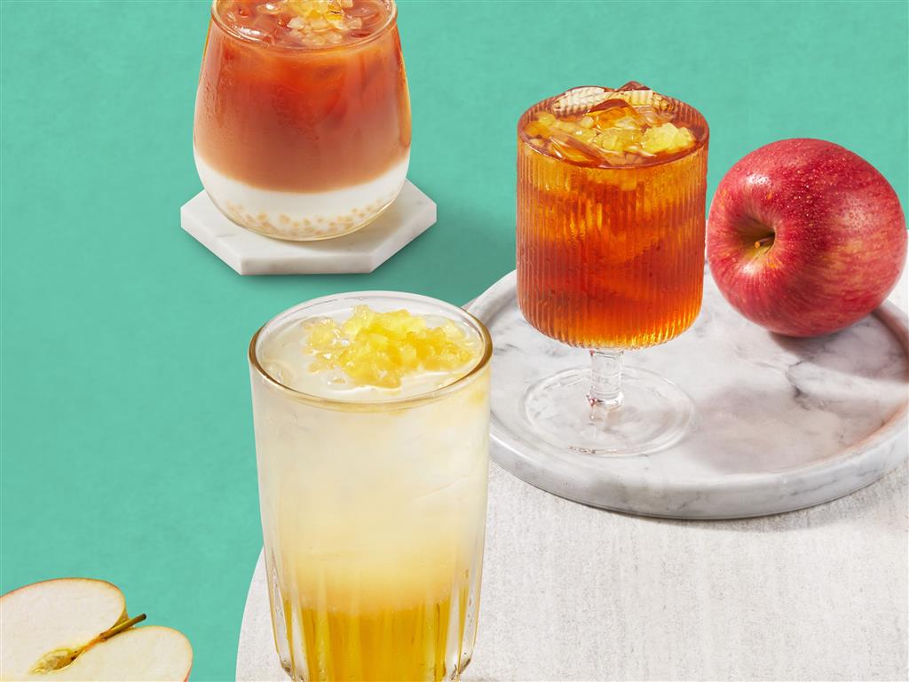 迷客夏推出的3款果茶新品「春蘋烏龍」、「蜜蘋檸綠」、「蜜蘋檸綠」都選用鮮紅飽滿的「富士蘋果」,因其果蜜含量高、香氣撲鼻濃郁且清甜脆口,甜度與酸度完美絕佳,分別搭配不同基底,包含春蘋烏龍搭配琥珀烏龍,蜜蘋檸綠則是以蜜漬蘋果丁混合酸香檸檬,再搭配茉莉原淬綠茶,而蘋果伯爵拿鐵以經典伯爵紅茶為基底,佛手柑香氣加乘蘋果果香,再融入滑順鮮奶中。