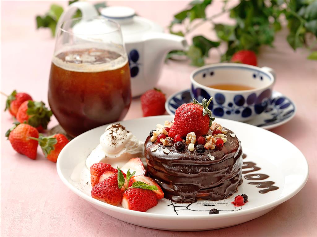 將獨特配方麵糊,煎製厚1公分的鬆餅後,將嚴選世界3大巧克力品牌CACAO BARRY、具香草甜度與可可苦香的58%苦甜巧克力、帶有焦糖香氣的蘭姆酒,以獨家8:1比例調製巧克力醬均勻淋上,再夾入酸甜適度的蔓越莓果醬,放上核桃、莓果、白巧克力碎與草莓後完成,鬆餅口感略帶Q彈,與巧克力醬完美的搭配,為情人增添濃情蜜意。套餐皆可任選2杯160元的飲品做搭配。