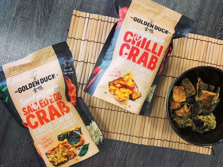 金鴨最新口味「鹹蛋黃蟹天婦羅紫菜」和「辣椒蟹天婦羅紫菜」皆是以新加坡正宗美食辣椒蟹為靈感,使用真正的蟹肉製作,打造出充滿濃濃螃蟹風味和層次感的鹹香零食 ! 「鹹蛋黃蟹天婦羅紫菜」將香濃鹹蛋黃和蟹肉結合,再加上炸得香脆的紫菜解膩,入口有濃郁的海鮮風味,是最佳下酒菜;「辣椒蟹天婦羅紫菜」則運用蟹肉、咖哩葉、辣椒等多種原材製作,香脆微辣的口感吃起來超過癮,喜歡辣味零食的朋友們千萬別錯過 !