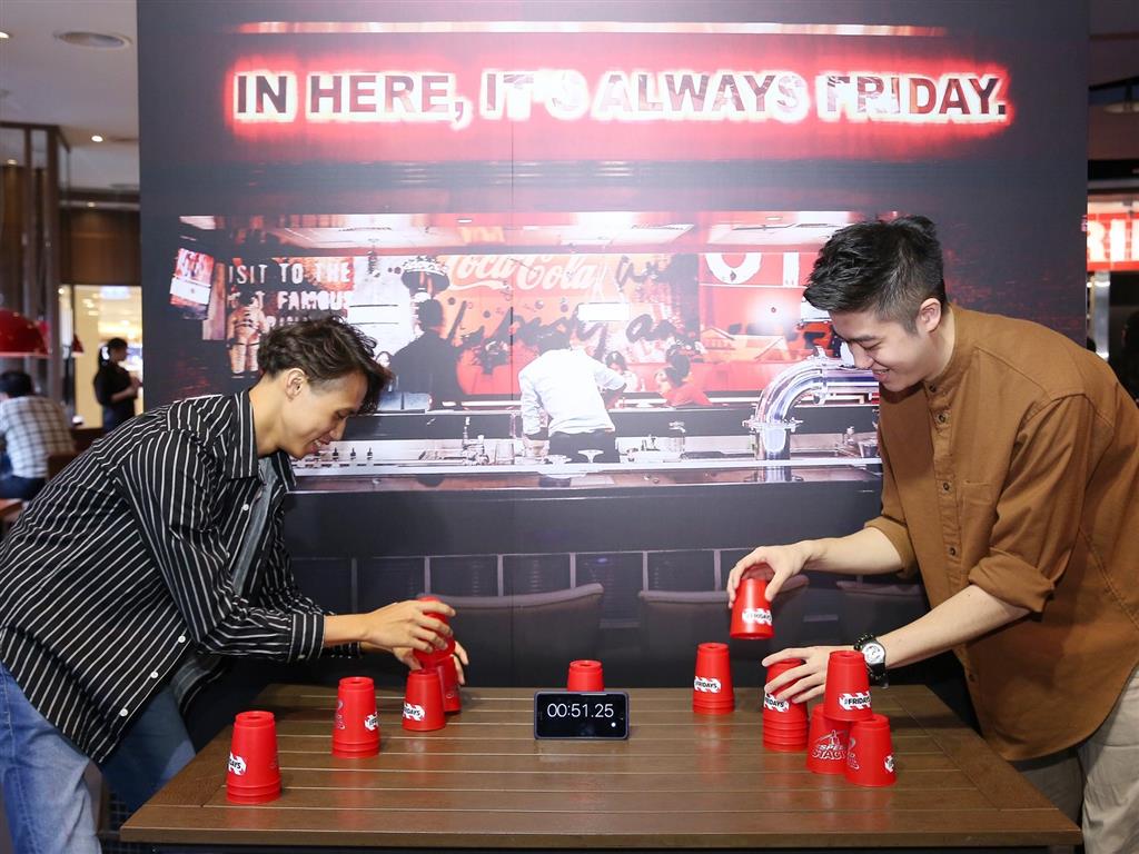 2、酷帥「花式疊杯限時賽」,說到美式調酒文化,FRIDAYS絕對是代表的先驅,調酒不只要好喝也要拚速度,揪兄弟們來FRIDAYS換上Bartender制服,化身帥氣調酒師,來場「競技疊杯」拚速度