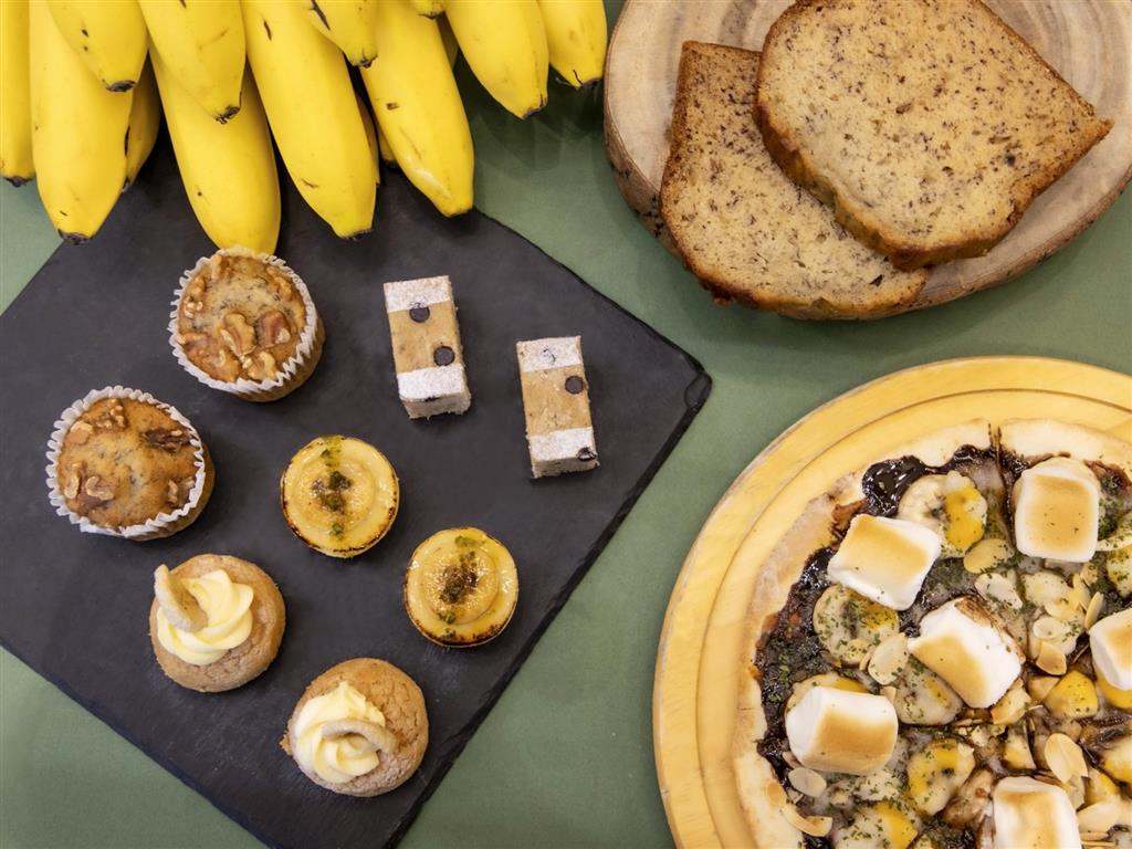 一禮烘焙則推出系列甜點,首推以滿滿香蕉泥製成的香蕉麵包,口感蓬鬆、香甜濕潤,充滿熱帶果香風情;此外一咬就爆漿的香蕉泡芙更是不可錯過,外酥內軟的口感加上新鮮香蕉製成的蕉泥卡仕達醬內餡,是很多人都無法抗拒的誘惑;還有香蕉濃起司蛋糕、香蕉馬芬、香蕉磅蛋糕等甜點,都讓香蕉迷一吃愛上,除在一禮烘焙預訂外,還可在六福萬怡敘日全日餐廳甜點區享用。不僅如此,六福村也運用大量香蕉於動物照養、六福客棧也將香蕉用於防疫便當搭配的水果,一起用行動支持蕉農。