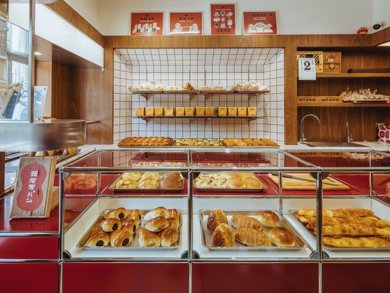 「蜷尾家パン」麵包屋邀請到本事設計與果多設計聯⼿操⼑室內及視覺設計,老宅⾨店堆疊出台⽇可愛復古氛圍!優雅湖⽔綠磚牆、年代感⾦屬展⽰窗和⽇系溫柔⽊質⼤⾨,⾨店內空間設計結合專業⽇式職⼈服務,由店員為消費者夾取麵包,希望親⼿傳遞珍貴溫暖麵包記憶;前店後廠使⽤透明玻璃區隔,⼀覽麵包製程透出安⼼氣息;店內牆⾯的紅線條交錯⽩磁磚設計,源⾃於創辦⼈⼩時候熟悉的麵包油紙袋,搭配創辦⼈收藏的各式台⽇老件及招財貓,打造老台及⽇式復古昭和感,彷彿坐上時光機,重現童年記憶中巷⼝飄香的復古麵包屋。