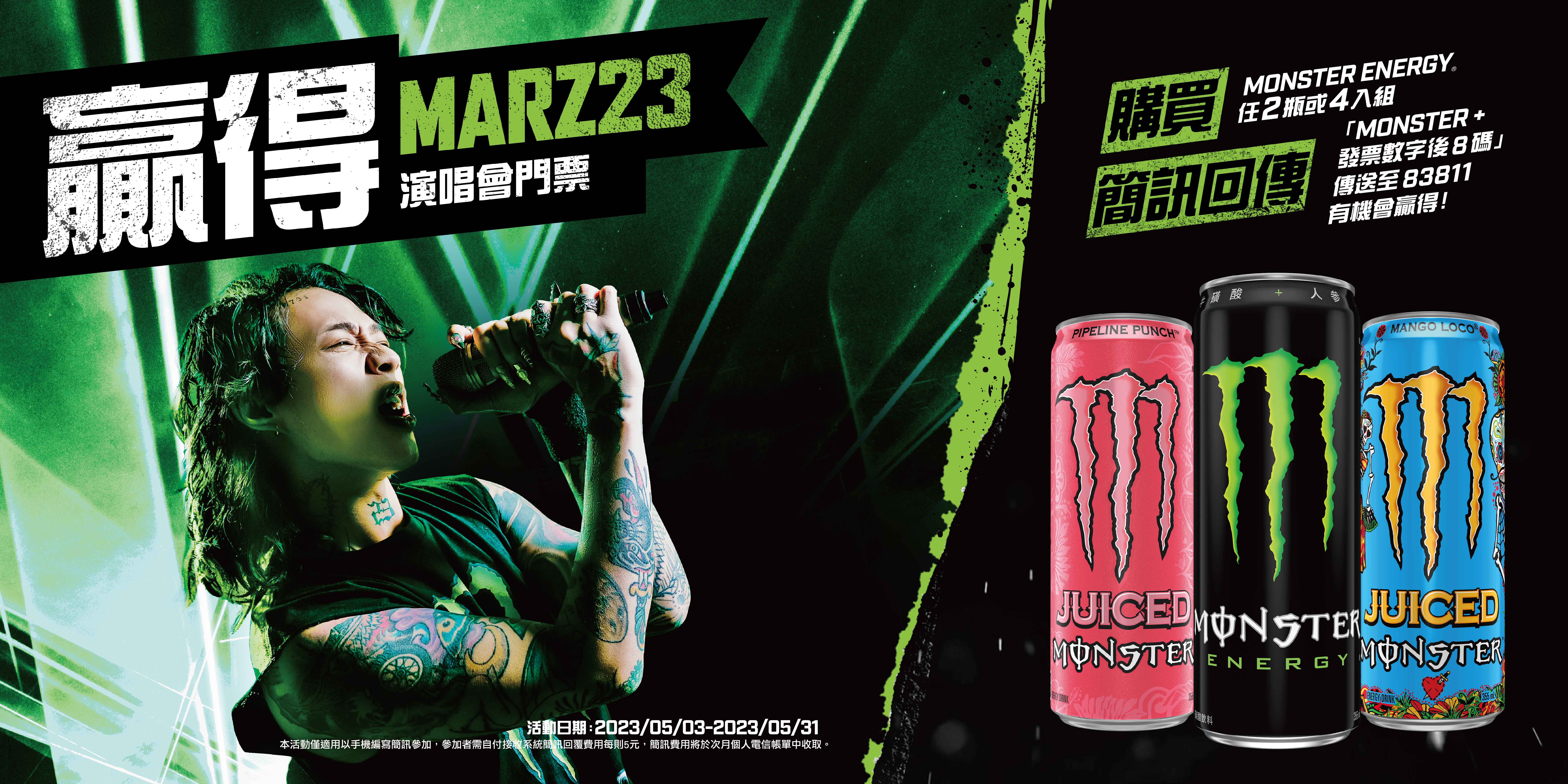 活動期間於指定通路單筆購買 2 瓶(含)以上Monster Energy 能量飲料,編寫簡訊「Monster+發票後8碼」回傳至83811可參加抽Marz23 演唱會門票。