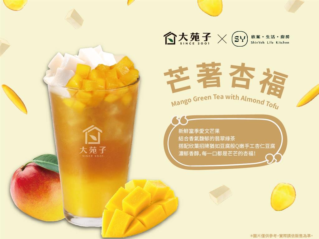 大苑子與欣葉生活廚房聯手推出「芒著杏福」,以清爽的當季飲品「愛文翡翠」,融合欣葉生活廚房滑嫩Q彈的杏仁豆腐,芒果丁帶出愛文芒果的香氣、杏仁豆腐擁有細膩口感,尾韻則保有茉香綠茶的清香。