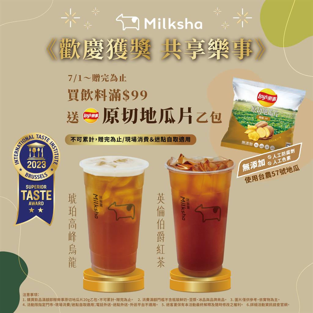 迷客夏自2008年創立以來,一路堅持以最高品質原物料打造出最美味的飲品,讓消費者喝得安心又健康。繼2023年2月迷客夏以2款招牌飲品「芋頭鮮奶」、「法芙娜純可可鮮奶」,獲得「A.A.全球純粹品味評鑑三星獎」,更於6月以英倫伯爵紅茶、琥珀高峰烏龍兩款茶葉,以綜合評比高分成績榮獲「ITI 風味絕佳二星獎章」,是一項高度認可的國際認證,同時也有「食品界米其林」的美名。迷客夏會持續堅持對原物料和飲品的高品質把關,提供安心又美味的飲品。歡慶迷客夏得獎,2023年7月1日~7月3日3天限定活動開跑,飲品消費滿$99即可獲得樂事原切地瓜片乙包。