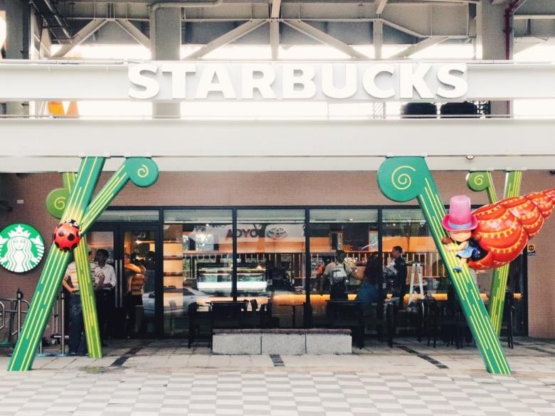 門市戶外區以幾米作品角色-瓢蟲與蝸牛女孩為裝置,藉由延伸的植物意象,讓室內與戶外相互連結融合。(圖片來源:星巴克提供)