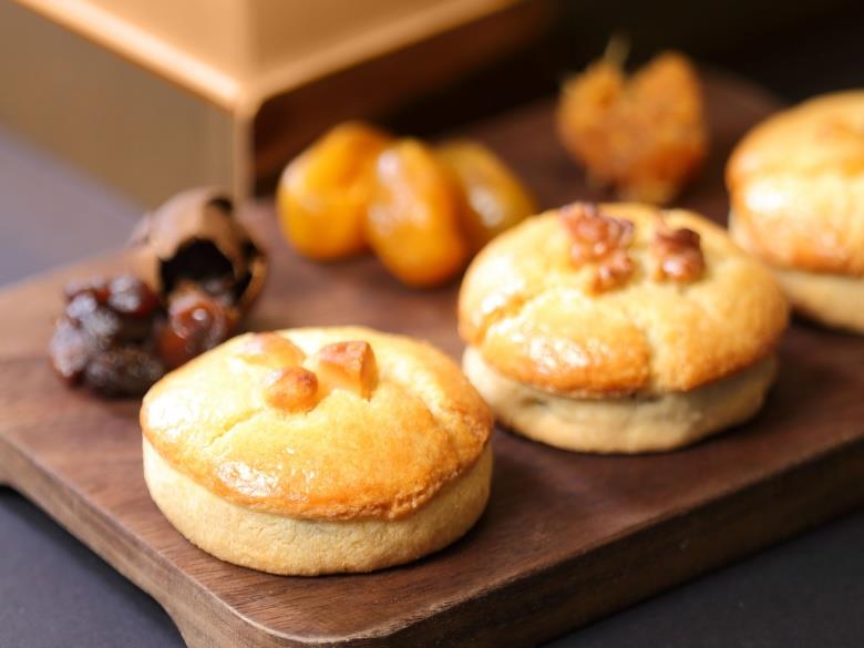 5款月餅當中,全新推出的《豐月》手作伍仁酥餅禮盒是以發揚台灣在地美好食材為理念,主廚精選嘉義煙燻桂圓、彰化土鳳梨以及宜蘭糖蜜金棗3種在地特產果乾為主角,並以廣式伍仁月餅為發想,將之加以改良、除了以白芝麻及葡萄籽油取代傳統做法的花生油及胡麻油外,內餡中加以調味的高粱酒也以西式的紅酒、君度澄酒及萊姆酒替換,烤得金黃香酥的餅皮當中,桂圓特有的香氣、鳳梨自然的酸甜以及糖漬金棗的甜而不膩,搭配上伍仁豐富的層次口感,讓酥餅各個都有了畫龍點睛的美味。另一款《賞月》茶.桃山月餅禮盒則是以木柵鐵觀音、三峽碧螺春、新竹東方美人、鹿谷凍頂烏龍、魚池紅玉紅茶、以及阿里山烏龍等在地好茶入饌,搭配各式堅果包入以香醇白豆沙製成的日式桃山餅皮當中,除了茶香滿溢的獨特滋味外,全新的金色禮盒包裝,更是充滿氣勢與質感。