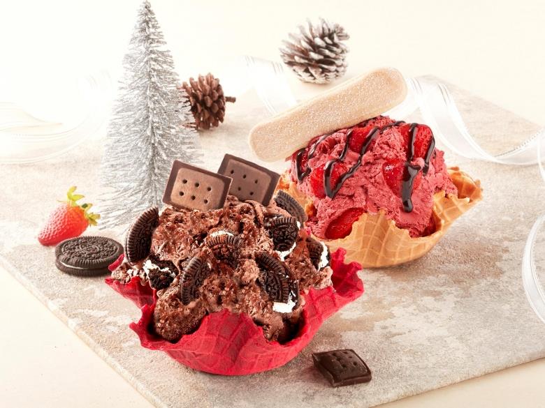 此外,耗時半年研發4倍濃郁的「耶誕濃巧克」,以黃金比例打造NO.1極濃巧克力冰淇淋,拌入爽脆OREO打造卡滋卡滋的驚喜口感,撒上純黑可可粉,妝點日本Bourbon苦黑帆船巧克力餅乾,極致濃郁的巧克力味蕾挑戰舌尖殿堂級滋味。為掌握聖誕節慶商機並強化視覺效果,以紅絲絨巧克力推限量「耶誕紅脆餅」、「耶誕紅甜筒雙球冰淇淋」,滿足求新求變的消費者,充滿巧思的新品將霸佔您的視覺與味蕾,顛覆聖誕冰品想像,必引起新一波話題討論。
