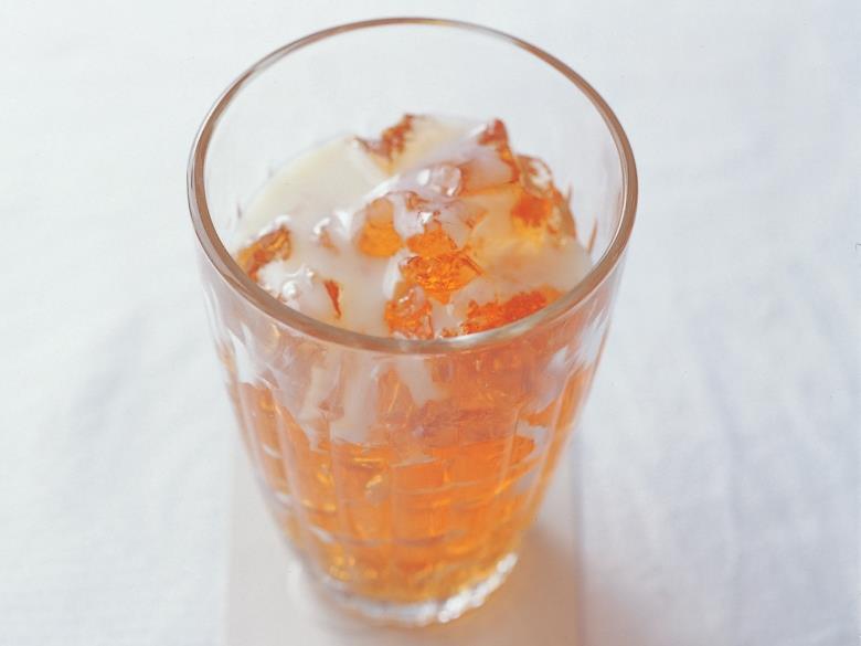 把冷卻凝固的茶凍攪碎,依喜好淋上煉奶。