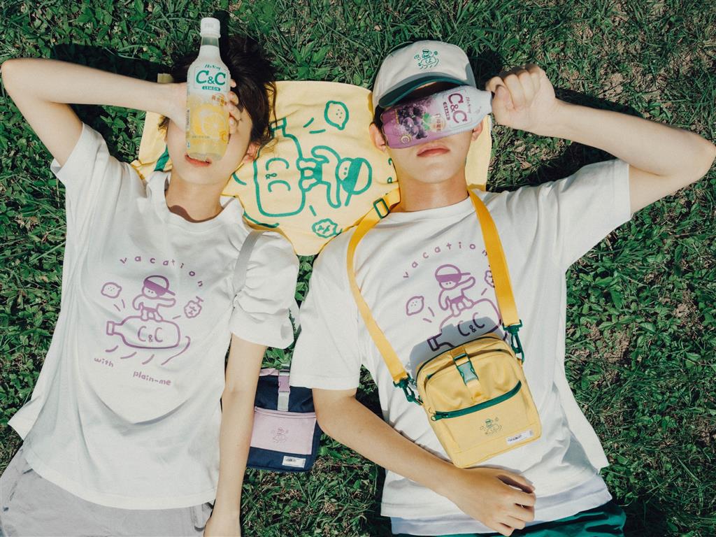 C&C氣泡飲添加果汁及維他命C,能夠滿足消費者一日所需活力,更是夏日消暑不可或缺的良伴,首次與plain-me聯名,希望為夏季消暑帶來新解方!運用描繪夏日旅行意象的「Vacation C&C with plain-me」專屬手繪插圖,融入到多款商品中,無論是以C&C經典的檸檬、葡萄口味推出的黃色、紫色元素的限定短TEE及PM旅行小包,還是刺繡短褲、拼色老帽、玻璃手拿杯及超細纖維毛巾,每一款商品從材質到色彩都帶來清新的舒適體驗,炎夏假期就跟著C&C和plain-me一起解放夏日的黏膩不適!
