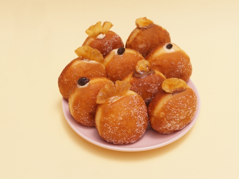 首波主打口味「雷夢」以檸檬奶油餡為基底拌入鳳梨丁並擺上風乾鳳梨片,大口咬下舌尖感受濃郁奶油餡甜味搭配清新淡雅檸檬酸味,鳳梨丁伴隨其中增添整體口感,酸甜風味令女性愛不釋手,炎夏時吃上一顆堪為最佳開胃甜點聖品;「蘭姆」採用奶油乳酪卡士達為內餡,加入酒漬蘭姆葡萄乾,圈頂以葡萄乾作為綴飾,還未入口前便能聞到蘭姆酒香,雖以口味厚實的乳酪為底入口時卻絲毫不膩口,反而在奶油乳酪與蘭姆葡萄的絕妙結合下,令人一口接一口,十足大人味滿足不嗜甜食的男性消費族群;「巧巧」選用比利時70%苦甜巧克力製作,填入水滴巧克力讓巧克力卡士達餡充滿口感,出餐前放上焦糖香蕉,便是大人小孩皆喜愛的經典巧克力香蕉口味。