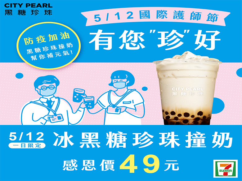 為感謝醫護人員辛勞,7-ELEVEN將於2020年5月12日推出「有您珍好」一日限定活動,凡在醫院內指定門市(共43店),憑該醫院員工證即可免費兌換黑糖珍珠撞奶乙杯(不限冰/熱),每人限兌換乙杯,限當日兌換完畢,每店限量200杯,一起為醫護人員加油!