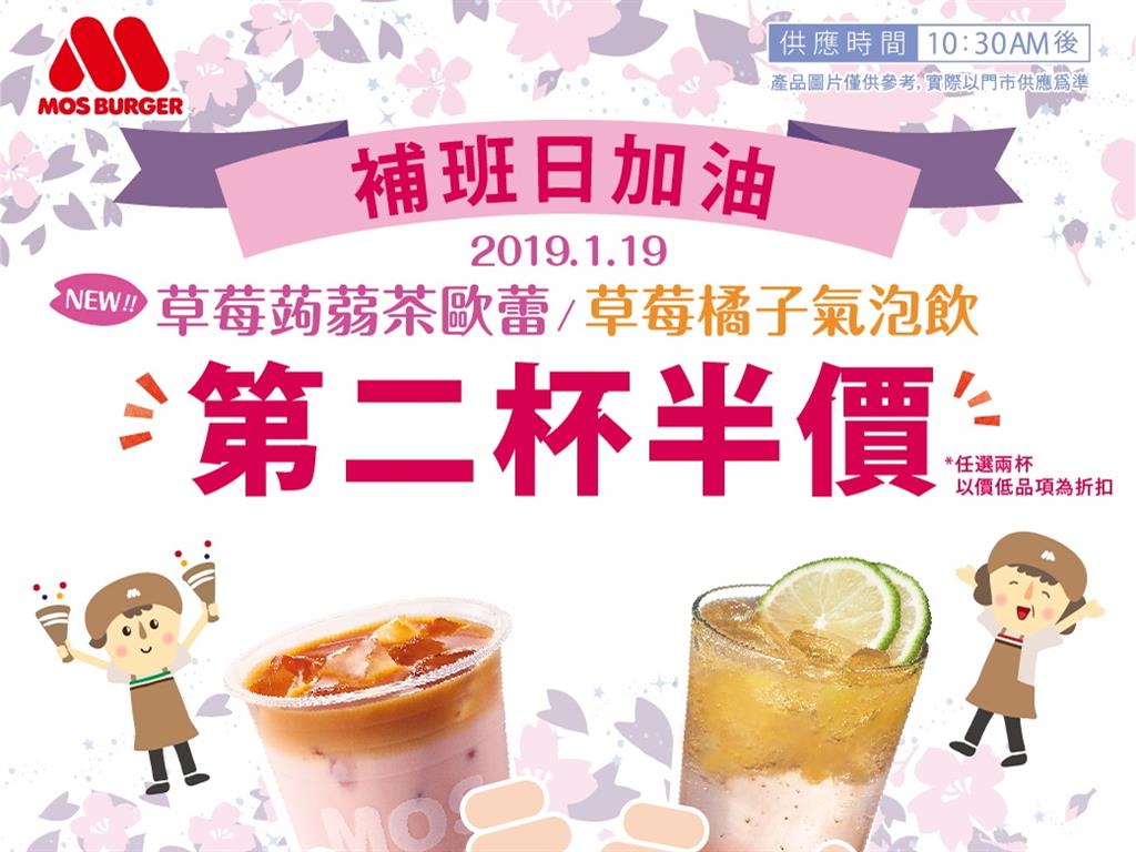 2019年1月19日週六將補班一天,為體恤上班族們的辛苦,摩斯漢堡推出飲料新品第二杯半價優惠,與同事分享好心情!