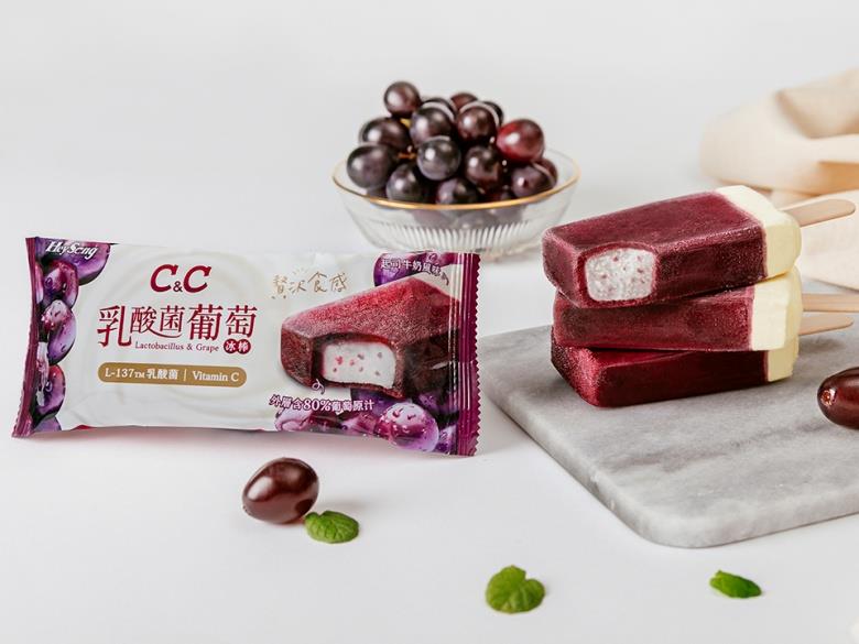 冰棒的外層採用80%葡萄果汁冰,內層為C&C乳酸風味剉冰,一口咬下還能吃到蒟蒻晶球;底層則選用乳香濃郁的起司牛奶雪糕,達到味蕾三重奏效果。