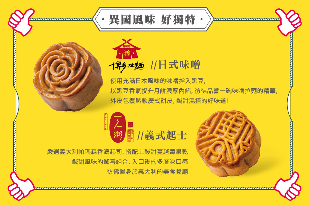 46年經典品牌「一之鄉」今年中秋以「品味生活美學」為主軸,將生活中的五感體驗一點一滴累積成獨一無二的品味生活,幻化成生命的感動,運用各種風格的設計,讓人們在紛擾不安的時空裡,能細細品味生活、感受一之鄉中秋禮盒的魅力。今年一之鄉與四大知名連鎖品牌:鮮茶道、三顧茅廬、怡客咖啡及博多拉麵,首創跨界聯名推出「眾星拱月」限量版禮盒,以經典復古的趣味提盒設計,內裝有以各品牌的招牌美味秘方所研發出的特色月餅,一盒入手即可品嚐到茶香、咖啡香、麻辣味及具異國風味的義式起士、日式味噌、台式黃金薯等六種不同風味月餅,令人驚豔不已,是今年中秋送禮的熱門選項之一。