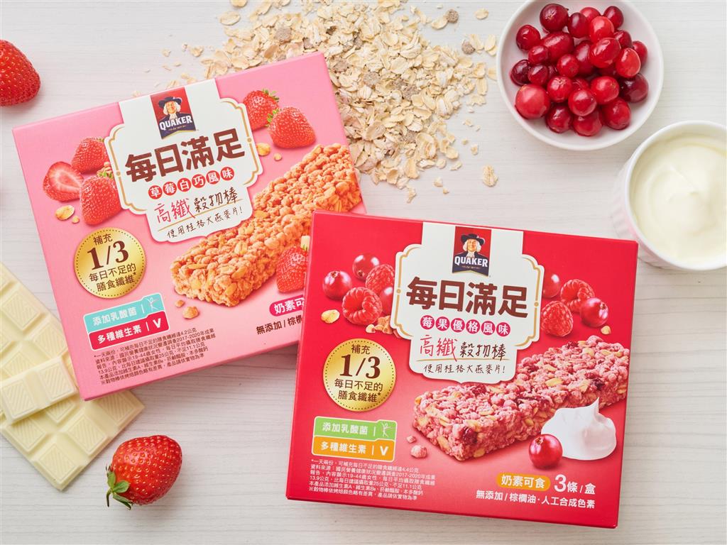 「桂格每日滿足高纖穀物棒」推出莓果優格及草莓白巧兩種口味。(圖片來源:桂格提供)