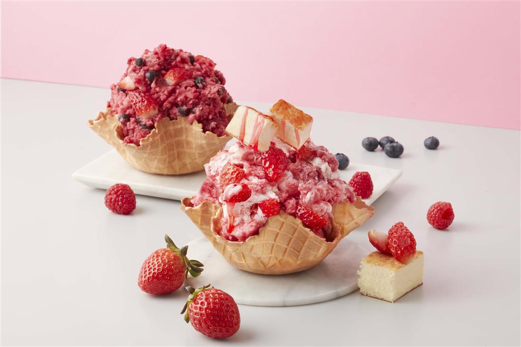 首次將「粉紅色」草莓冰淇淋融合「桃紅色」五種莓果的綜合莓雪貝,拌入嚴選法國直送的草莓,淋上多道工法熬煮的草莓醬,再放上香醇濃郁的重乳酪蛋糕,不但將其融合鹹香的義大利帕達諾起司、更搭配日本昭和蛋糕專用麵粉製成的泡芙蛋糕,成就多層次驚喜滋味。