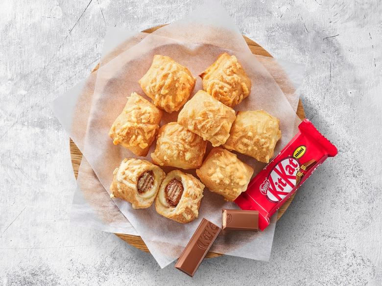必勝客「爆爆芝心球 X KitKat巧克力」將塊狀KitKat巧克力包入招牌芝心餅皮,以獨特創意打造多層次口感。(圖片來源:必勝客提供)