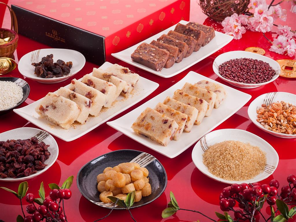 長榮鳳凰酒店(礁溪)推出兩甜一鹹年節伴手禮,厚實飽滿的「紅豆年糕」、吃得到干貝與鴨賞的「干貝鴨賞糕」以及融合中西特色的「酒香紅莓桂圓糕」。