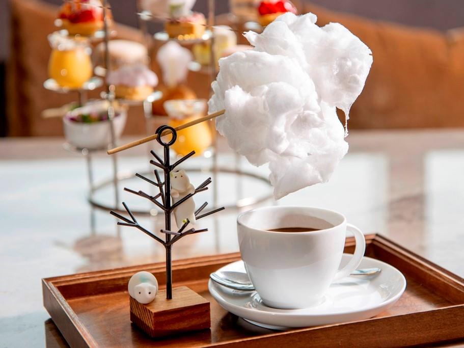 The Lounge則推出3款雲朵特調飲品,皆可做成冰或熱飲,搭配雙人下午茶可挑選2杯。其中,「雲朵咖啡」最為夢幻,軟澎澎的白色棉花糖變成一團雲朵飄在黑咖啡上,隨著咖啡的熱氣緩緩往上蒸,棉花糖開始下起甜甜細雨,為咖啡增添甜味,也交織出雲與雨的浪漫畫面;「愛跳芭蕾的JC Cat」絕對滿足超萌少女心,粉紅色草莓歐蕾上頭撒著兒時記憶的跳跳糖,杯盤則趴著一只可愛的翻糖喵咪,喝之前先聞到瀰漫的草莓香氣,滑入舌尖後的嗶啵口感及甜蜜滋味,每一口都是驚奇;姊姊們最喜愛「熱帶香草菊蜜茶」,成熟韻味帶著些許俏皮,杯中一抹棉花糖雲朵,有隻翻糖貓咪慵懶地趴在上面,隨著熱茶注入杯中,棉花糖迅速消失,貓咪墜落到杯子裡,每喝一口茶,都會看到貓咪翻滾,好似在茶中潛水優游,淡淡的菊花茶香伴有一絲棉花糖的微甜,讓心跟胃都同時被治癒了。