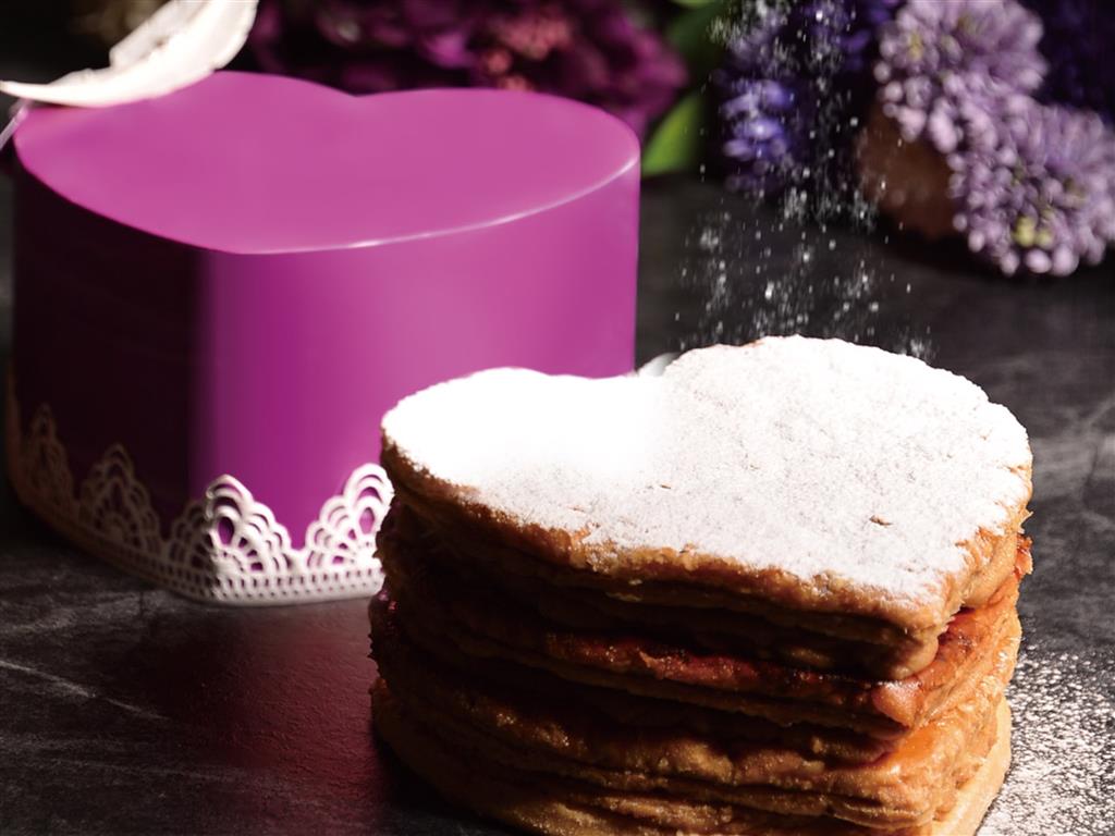 甜點主廚王哲廷發揮巧思,將母親節蛋糕幻化成最美味的驚喜!源自法國的千層酥,傳統上是由三層酥皮搭配兩層鮮奶油,主廚顛覆傳統,將培根高溫烘烤出培根油,再以培根油去拌炒焦糖蘋果,並加入白蘭地平衡蘋果酸澀味,製作成甜中帶鹹的香濃內餡,最後撒上香酥培根點綴,搭配上自製的千層心型外皮,一層一層堆疊出對母親滿滿的愛,最後蓋上以巧克力製作的心型外殼,別出心裁的造型與層次分明的獨特口感,帶給媽咪全新的視覺與味覺雙重享受。