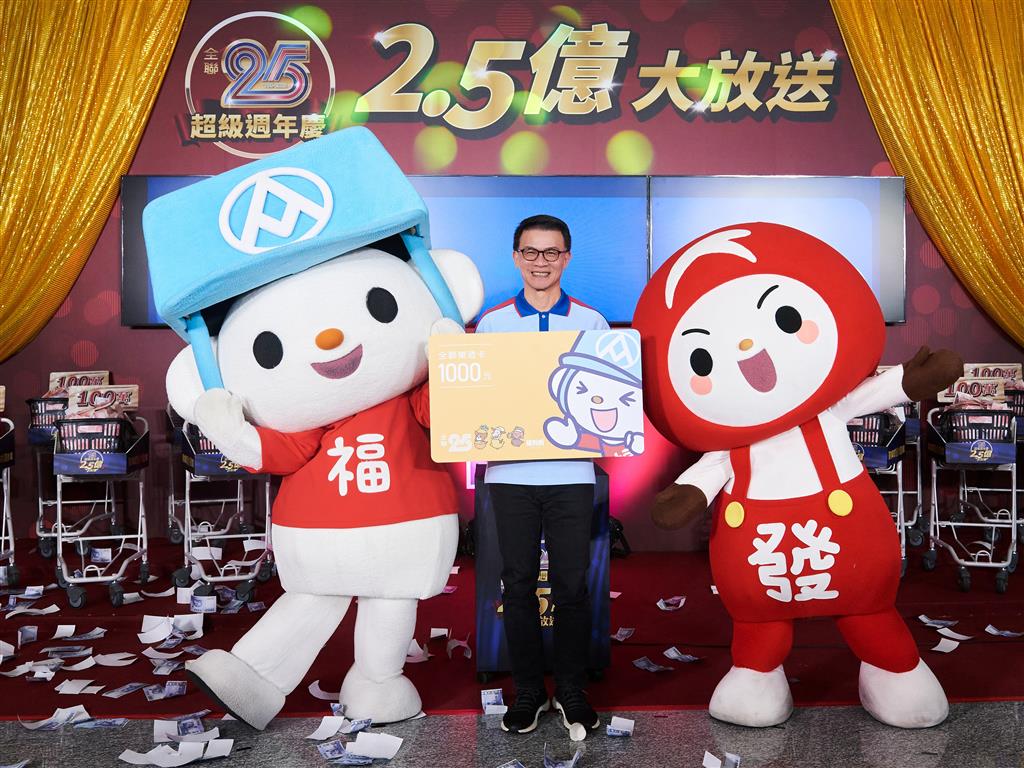 全聯25週年慶挑戰台灣通路史上最強2.5億回饋,大手筆祭出超有感4000萬獎金。史上最長77天週年慶,週週抽百萬現金頭獎,連續11週從頭抽到尾,早買早抽獎,買越多抽越多,中獎機率就越高!週年慶到全聯買菜就像買彩券,購物車就是你的運鈔車,共25個100萬現金大獎等你推回家!