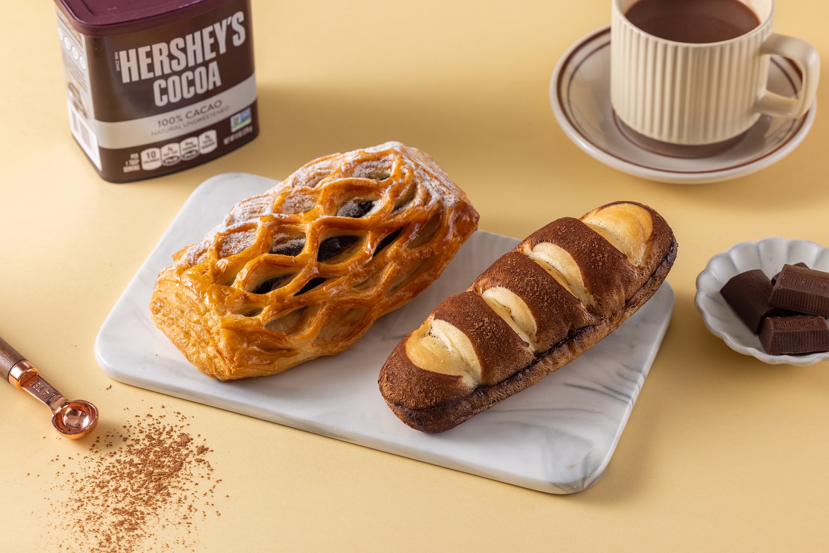 「好時巧巧丹麥」,酥香丹麥搭配巧克力內餡超美味;同時推薦帶有嚼感的「好時巧巧軟法」,抹上滑順巧克力奶霜餡,甜而不膩、巧克力香氣濃郁。(圖片來源:統一超商提供)