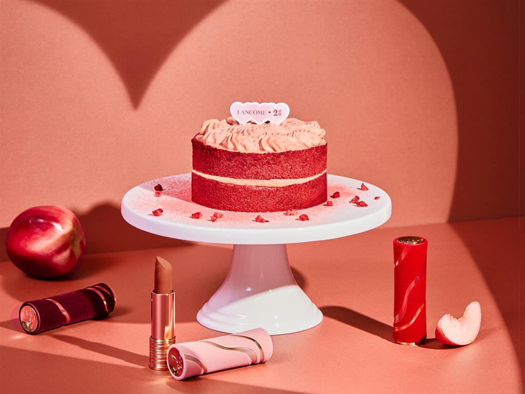 這次的合作,貳樓特別復刻了人氣的紅絲絨蛋糕,打造全新升級的「浪漫限定裸桃粉絲絨」。完美呈現蘭蔻唇膏#280裸桃粉棕的溫柔氣質,蛋糕抹上特調的裸桃粉棕奶油乳酪,質地如小蠻腰唇膏般滑順細緻,夾帶著蜜桃果粒,搭配百年經典紅色海綿蛋糕,增添整體口感層次,每一口都是不甜膩的完美平衡,絕對是2025年最適合慶祝情人節的蛋糕!