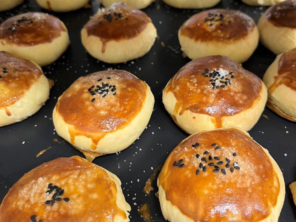 台中人氣麵包店也吃得到秒殺甜燒餅!使用日本上白糖、日本進口麵粉、發酵奶油,烤焙前再撒上黑芝麻及法國鹽之花,以增添香氣及鹹味,呈現出金黃酥脆完美色澤及口感。內餡甜而不膩與表層芝麻香氣相互融合,最後更能品味到絲絲鹹味,令人回味無窮。