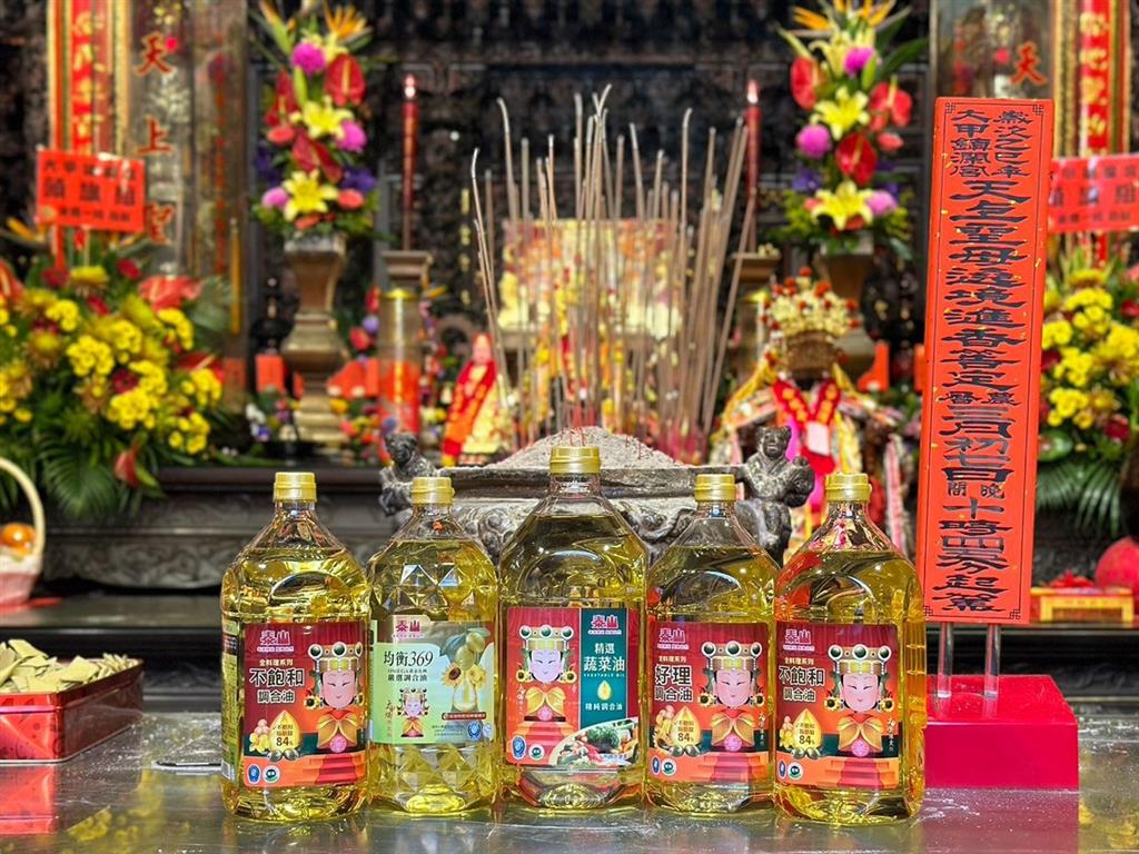 2025大甲媽即將於4月4日起駕遶境,泰山聯名鎮瀾宮推出媽祖平安油、買點心油品抽金飾。(圖片來源:泰山提供)