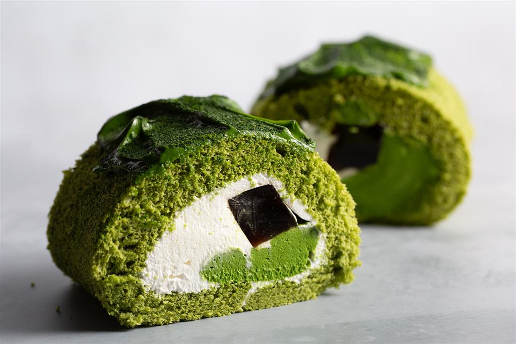 以柔軟的海綿蛋糕,將小山園抹茶的香韻密密捲起來。首先最表層為抹茶巧克力香緹,以白巧克力增添香氣與絲滑口感,同時也作為夾餡,與蛋糕體、香醇生乳餡甜蜜交纏。中心夾一塊黑糖蕨餅,是主廚巧思,微微Q彈加上黑糖香,正巧與清新茶香成有趣對比。