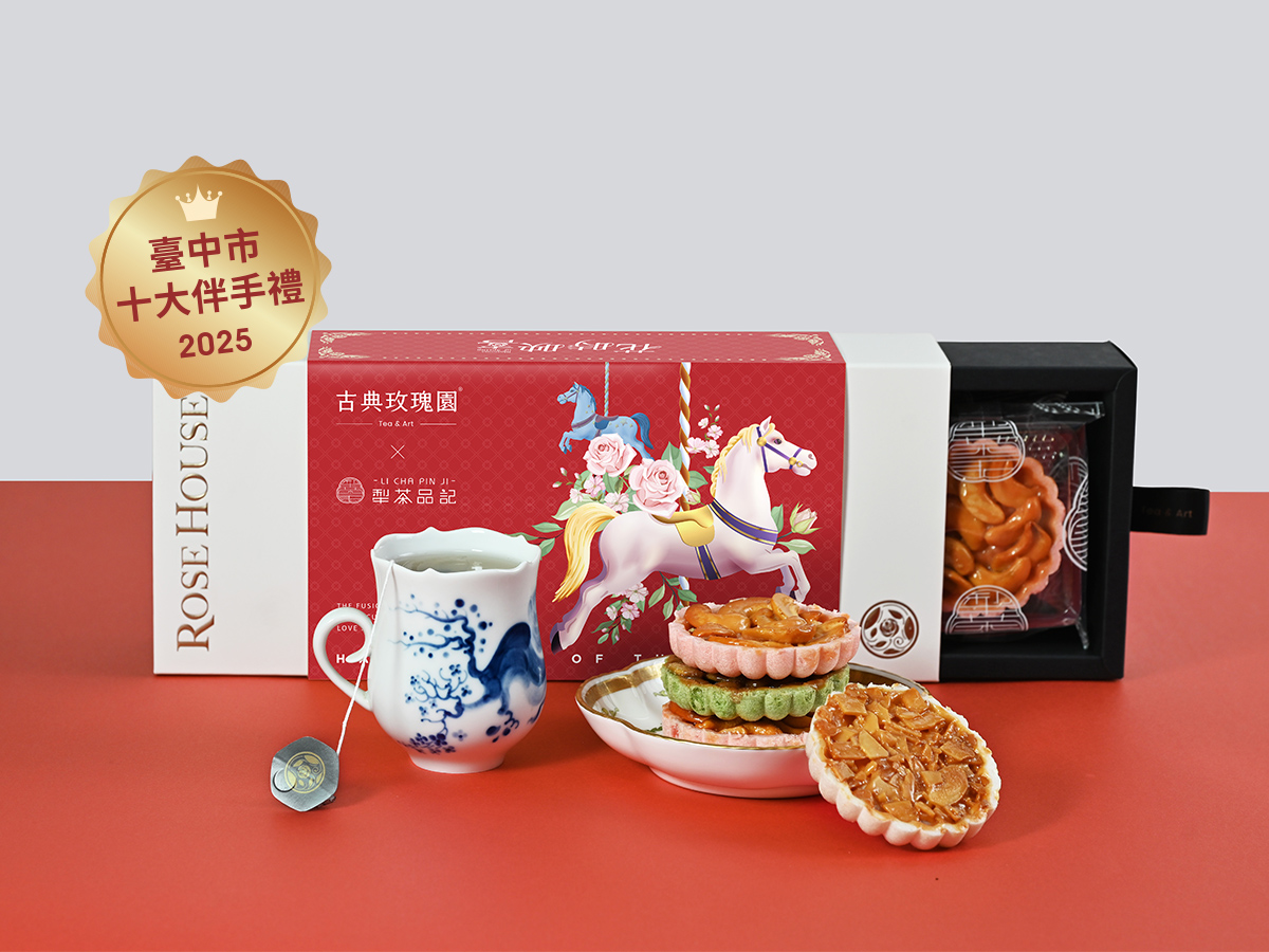 古典玫瑰園聯手台中十大伴手禮「犁茶品記」推出春節限定禮盒,經典茶品與人氣茶點跨界結合,不但有小王子元素設計,還有馬年專屬封套送禮需求一次到位,早鳥優惠開跑2026年1月4日前享86折。