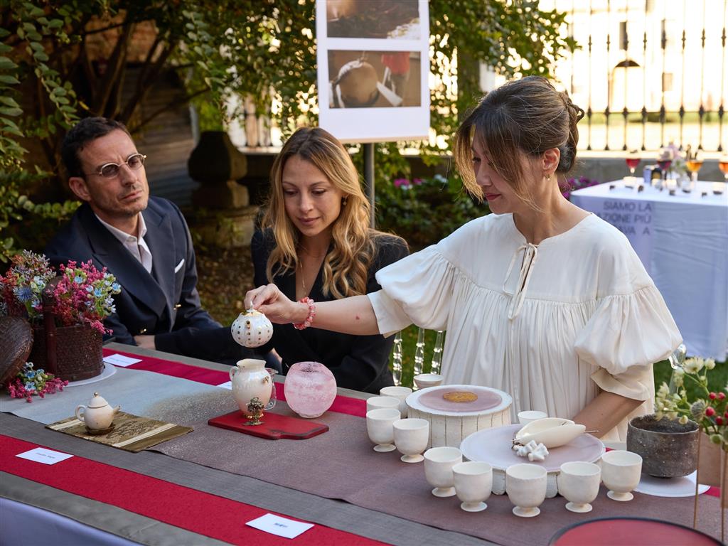 下午四點日落前的魔幻時刻,東方茶席茶香繚繞威尼斯運河畔,茶人高翠霞佈置一桌美好茶席表示:「這次我們帶來許多台灣工藝家的作品,以紅烏龍茶與茶席美學,款待賓客。」