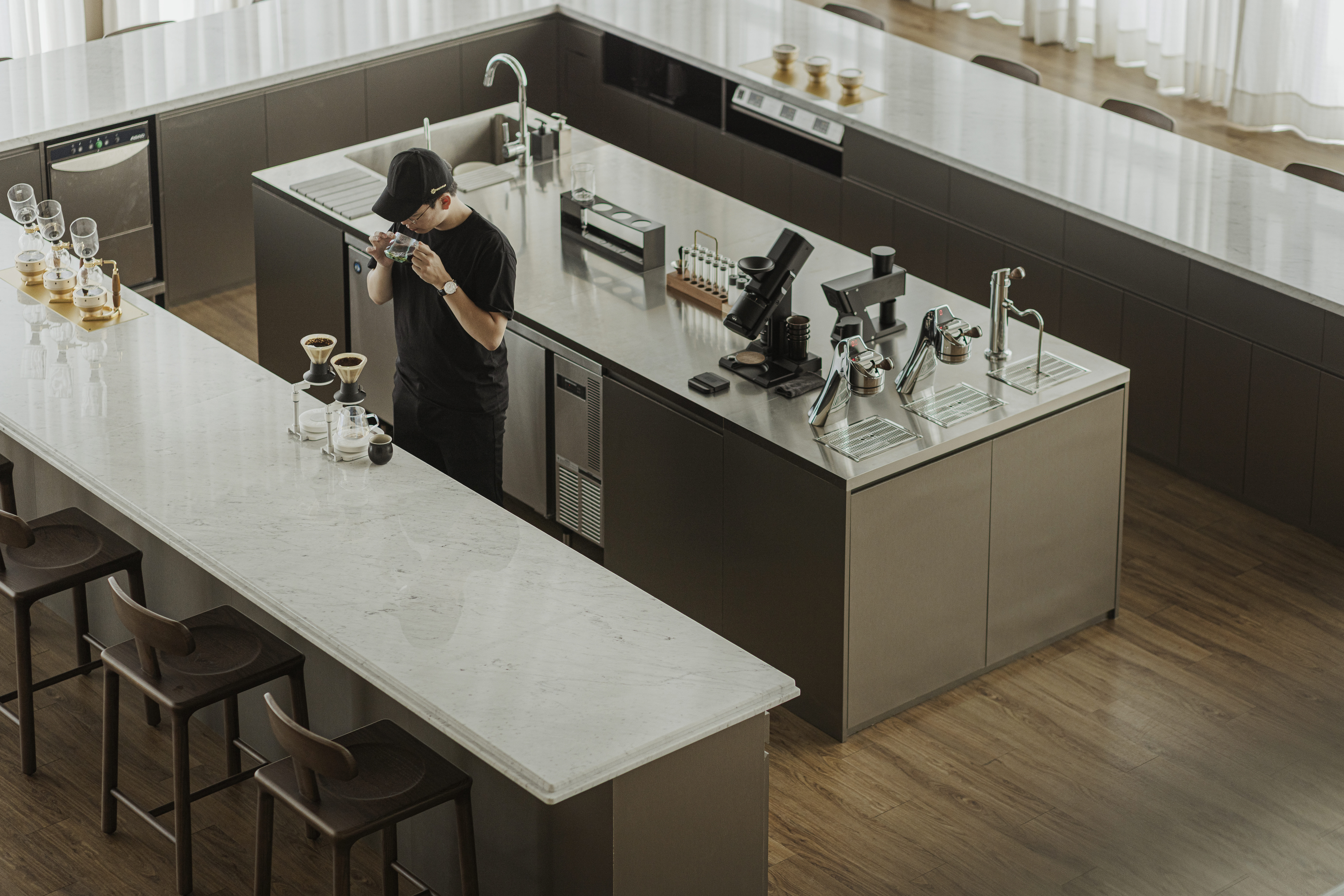 為專業演示規劃的中島設有頂級義式咖啡機與磨豆機,ㄇ字吧檯兩側則設有加熱燈,在這裡,Ninety Plus的咖啡研學可從熟悉的義式、手沖、虹吸,到花式咖啡調飲一應俱全,關於咖啡的學問與創意在此能無盡水平與垂直地延展開來。