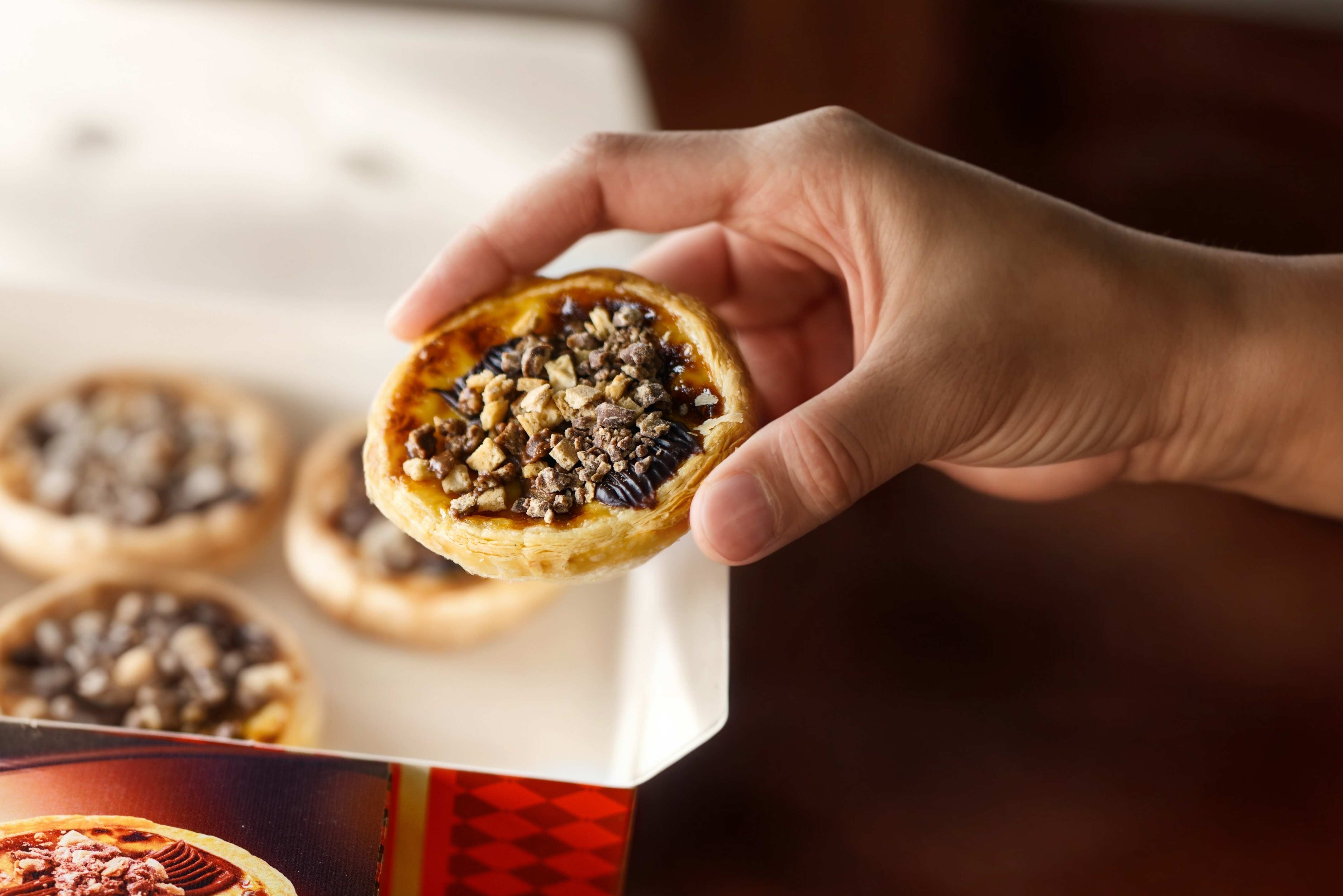 肯德基「奇巧可可流心三重奏蛋撻」每一口同時充滿著濃郁、滑順及酥脆的飽滿層次堆疊,帶給可可控三重極致享受。(圖片來源:雀巢提供)