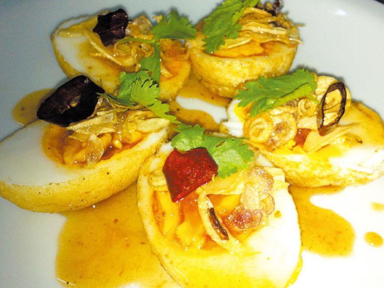 Step 4將炸好的蛋對切,淋上醬汁灑上大蒜、紅乾蔥與辣椒片,放上香菜做裝飾。